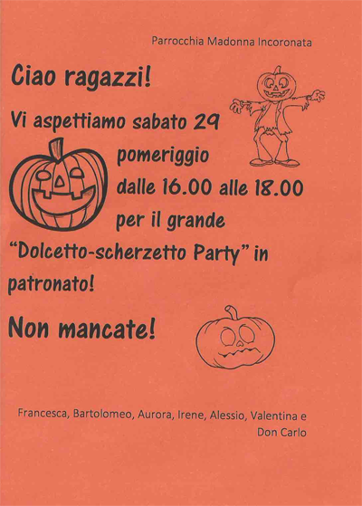 Vi aspettiamo in patronato per il grande "Dolcetto-scherzetto Party" dedicato a tutti i bambini delle elementari.